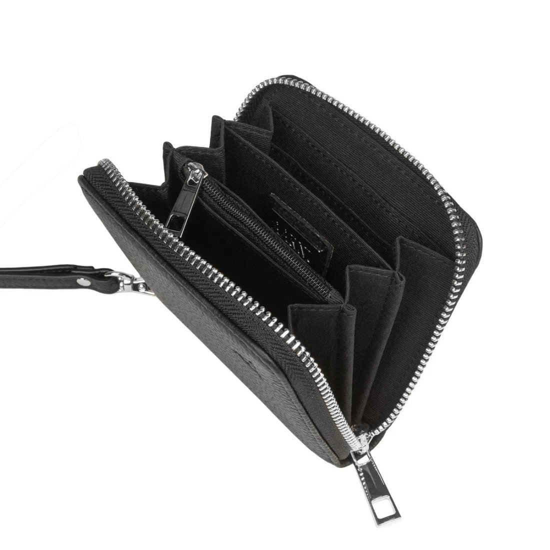 Lompakon sisäpuolella on yhteensä 6 korttipaikkaa, 3 avotaskua. Lompakon keskellä on vetoketjullinen kolikkotasku. Mukana tulee irrotettava rannehihna. Lompakossa on RIFD- suojaus joka pitää huolen, ettei korttejasi skannata väärin perustein.