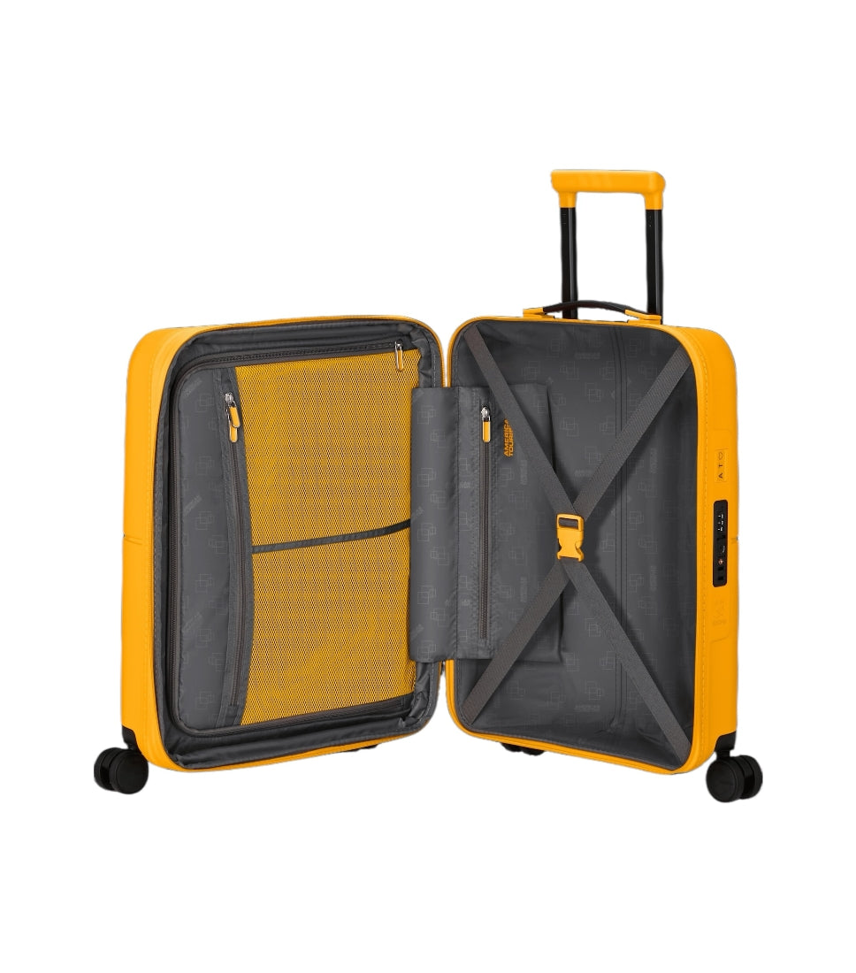 Laadukas American Tourister Dashpop lentolaukku kulkee vaivattomasti mukanasi neljän pyörän ansiosta. Laukun jokaisessa kulmassa on kaksi laadukasta pyörää. Sisätilat on jaettu kahteen osaan ja toiselta puolelta löytyy henkselit pitämässä tavaroista paikoillaan. Laukussa on TSA numerolukitus.