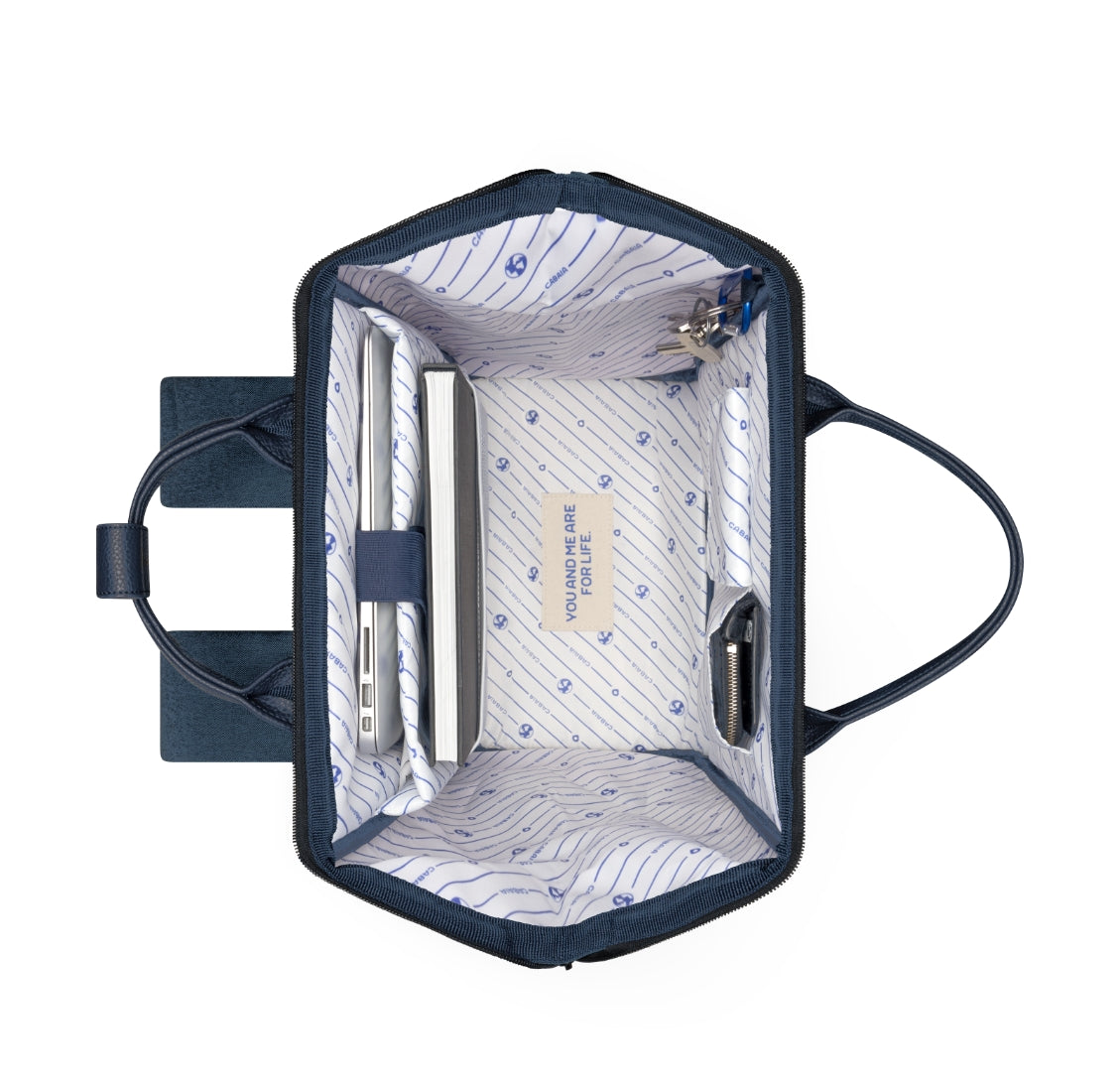Reppu aukeaa päältä vetoketjulla, ja sen kehysrakenteen ansiosta se avautuu suureksi, mikä helpottaa tavaroiden pakkaamista ja ottamista repusta. Repun sisävuori on kauniisti kuvioitu, ja sisäpuolella on lisäksi avotasku, tarralla suljettava tasku, avainnpidike, tilava verkkotasku ja pehmustettu tasku max 15-tuumaiselle kannettavalle tietokoneelle.