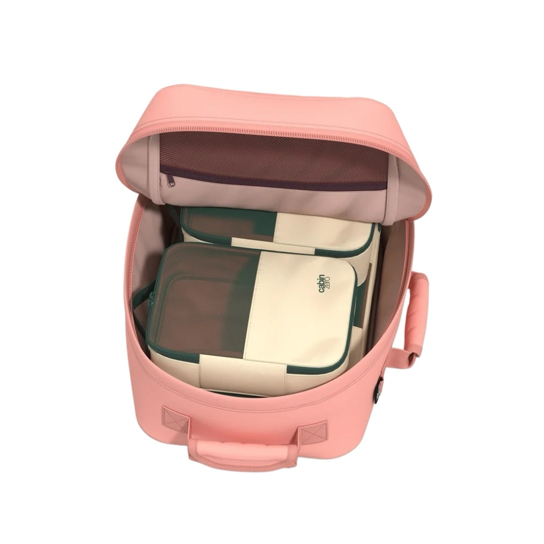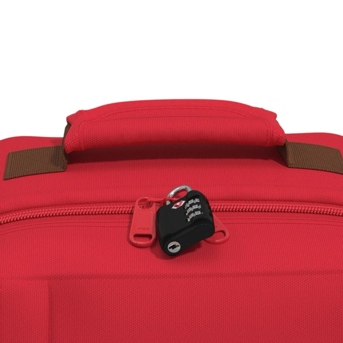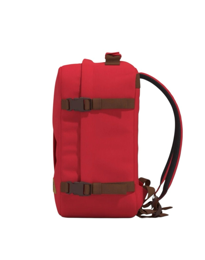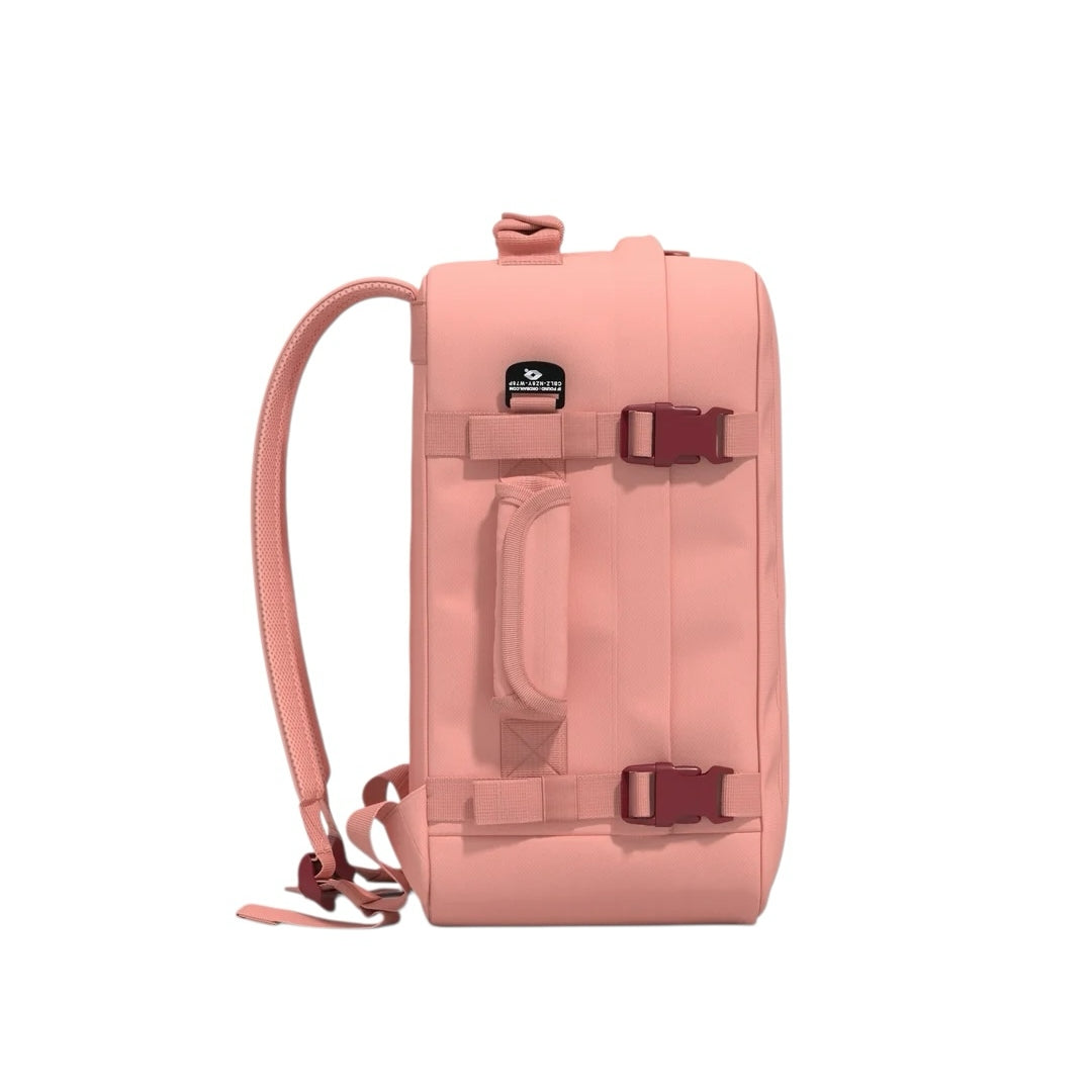 Sivuilla on myös kiristettävät hihnat, joilla voit puristaa reppua kapeammaksi jos lentoyhtiön kokorajoitus uhkaa ylittyä.