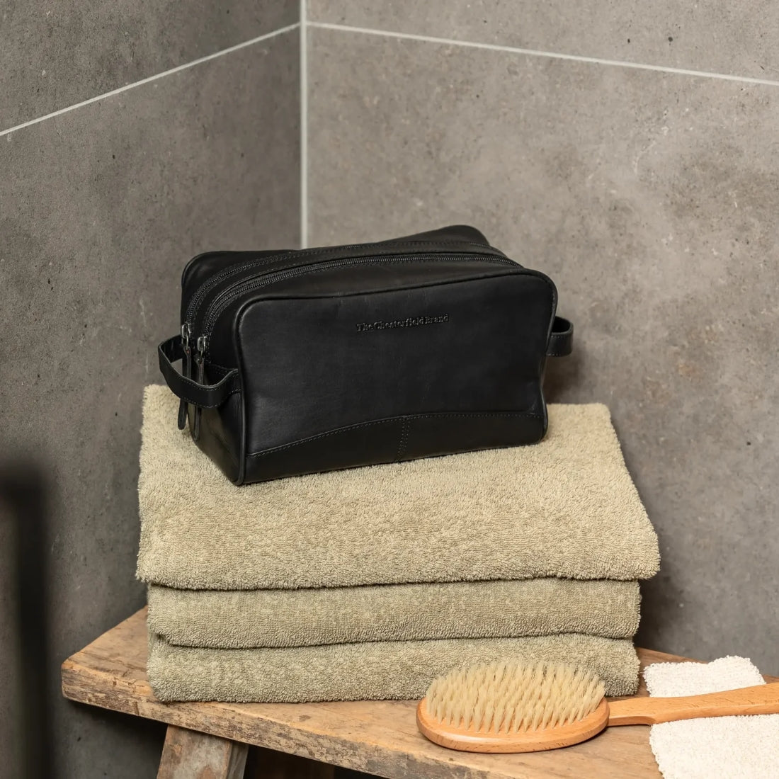 Chesterfield Stacey on tyylikäs aitonahkainen toilettilaukku. Siinä on kaksi erillistä vetoketjullista osiota, joista toisen sisällä on pieni vetoketjutasku. Myös takapuolella on vetoketjutasku. Molemmilla sivuilla on kahvat, joista toiletlaukun voi halutessaan ripustaa vaikka roikkumaan.