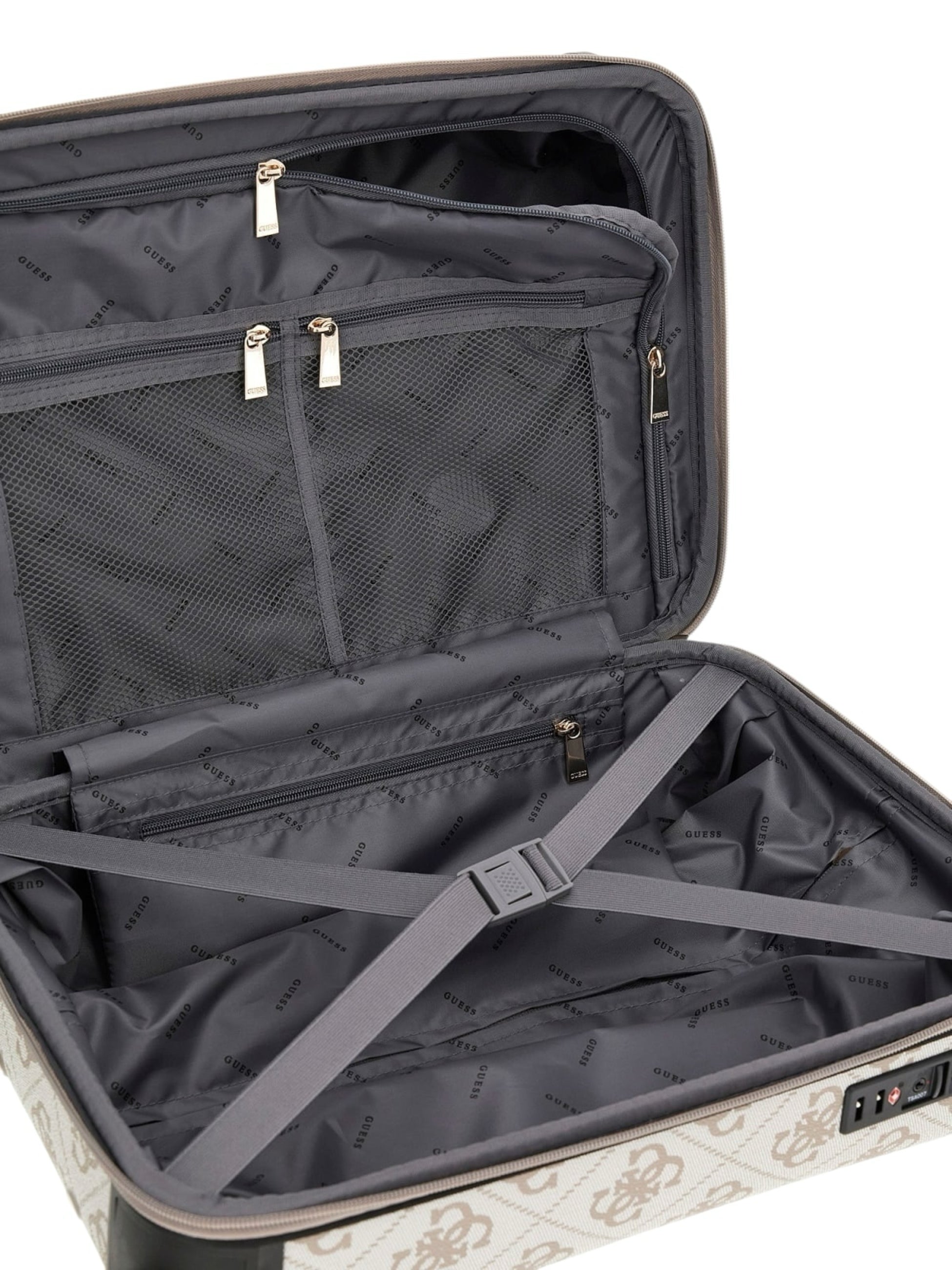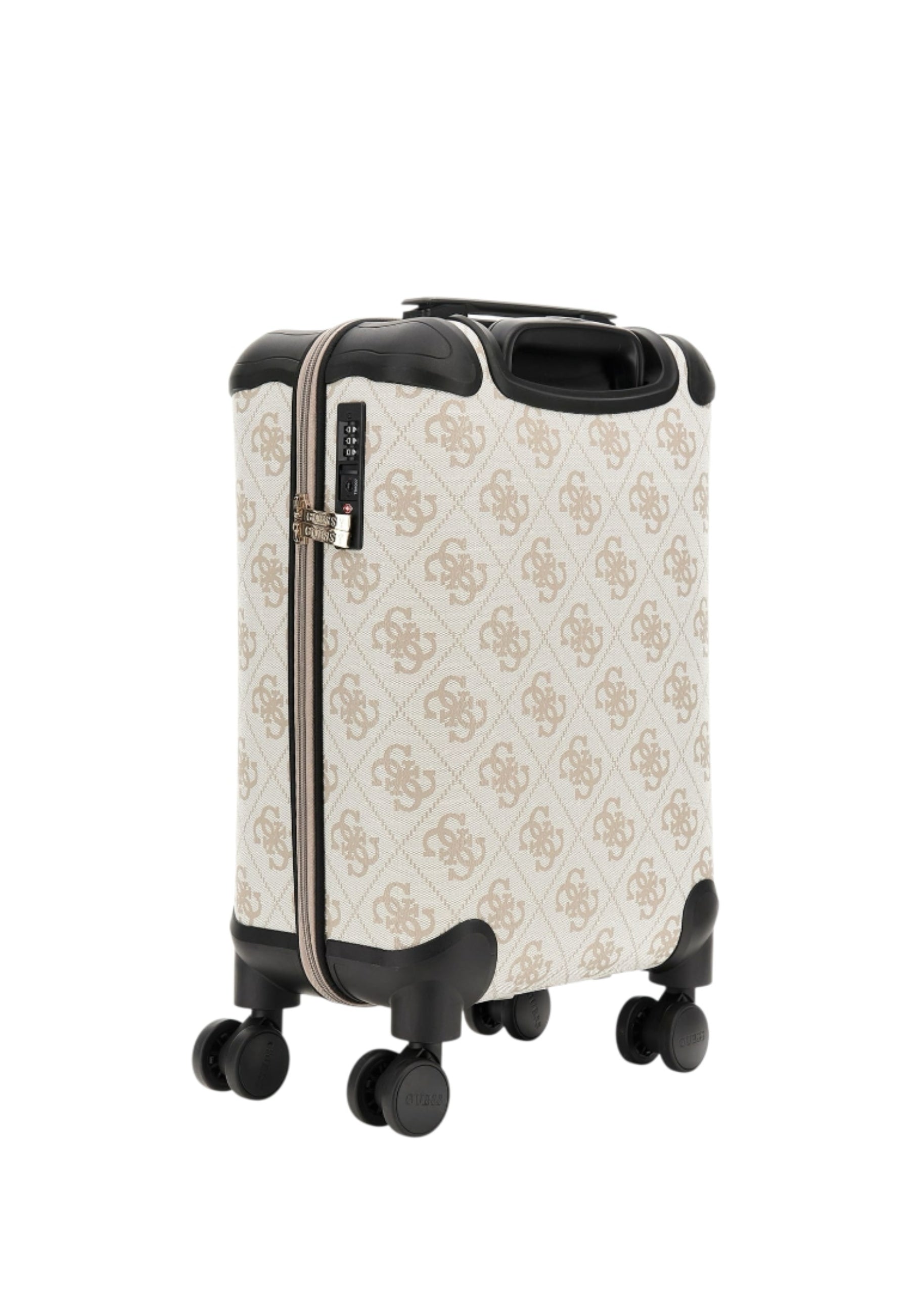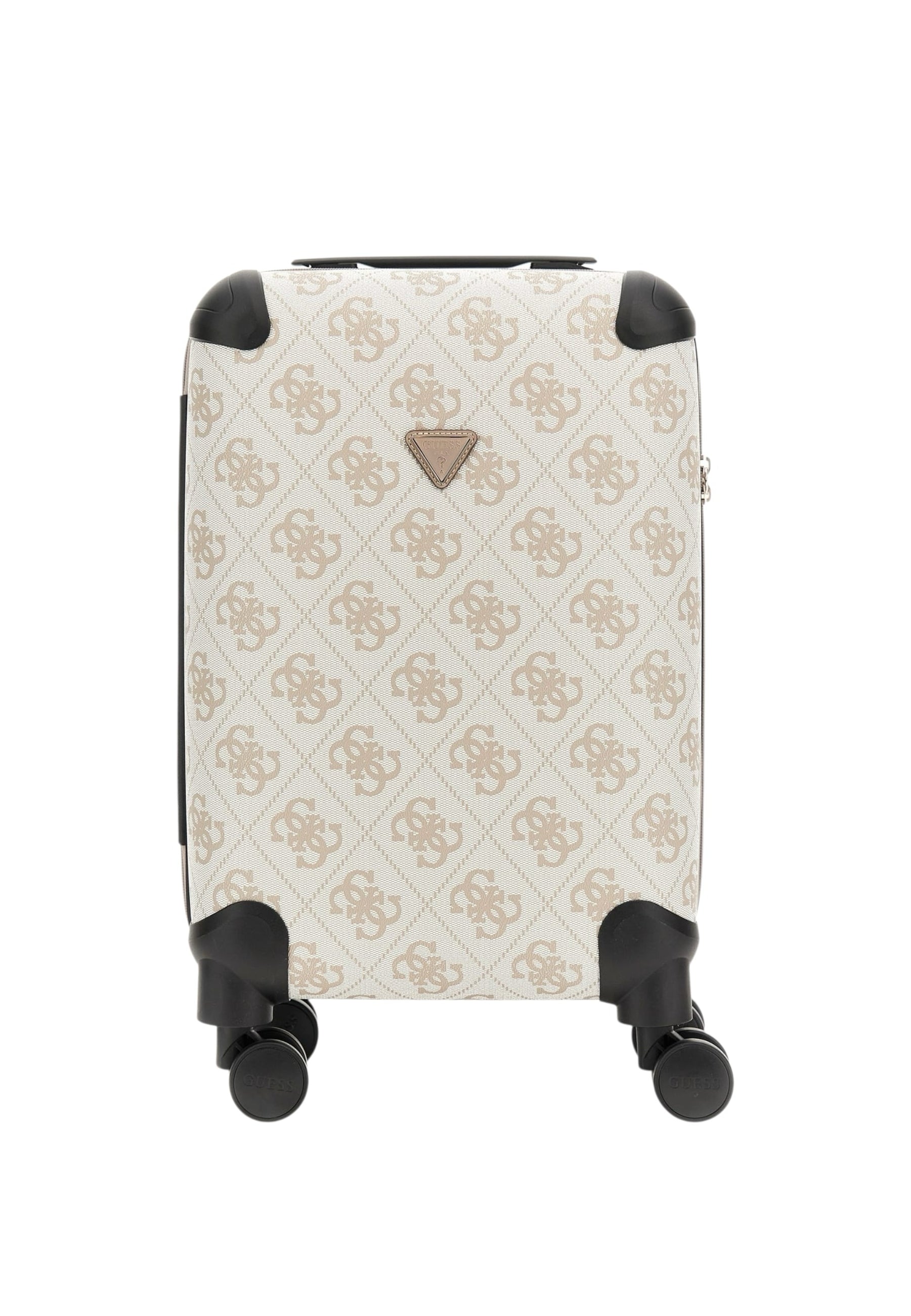 Koe matkustaminen uudella tasolla Guessin kovapintaisella lentolaukulla. Neljä pyörää takaavat sulavan liikkumisen. Lukollinen laukku sulkeutuu kaksisuuntaisella vetoketjulla. Laukussa on kaksi isompaa vetoketjulla suljettavaa taskua sekä kolme pienempää vetoketjutaskua.