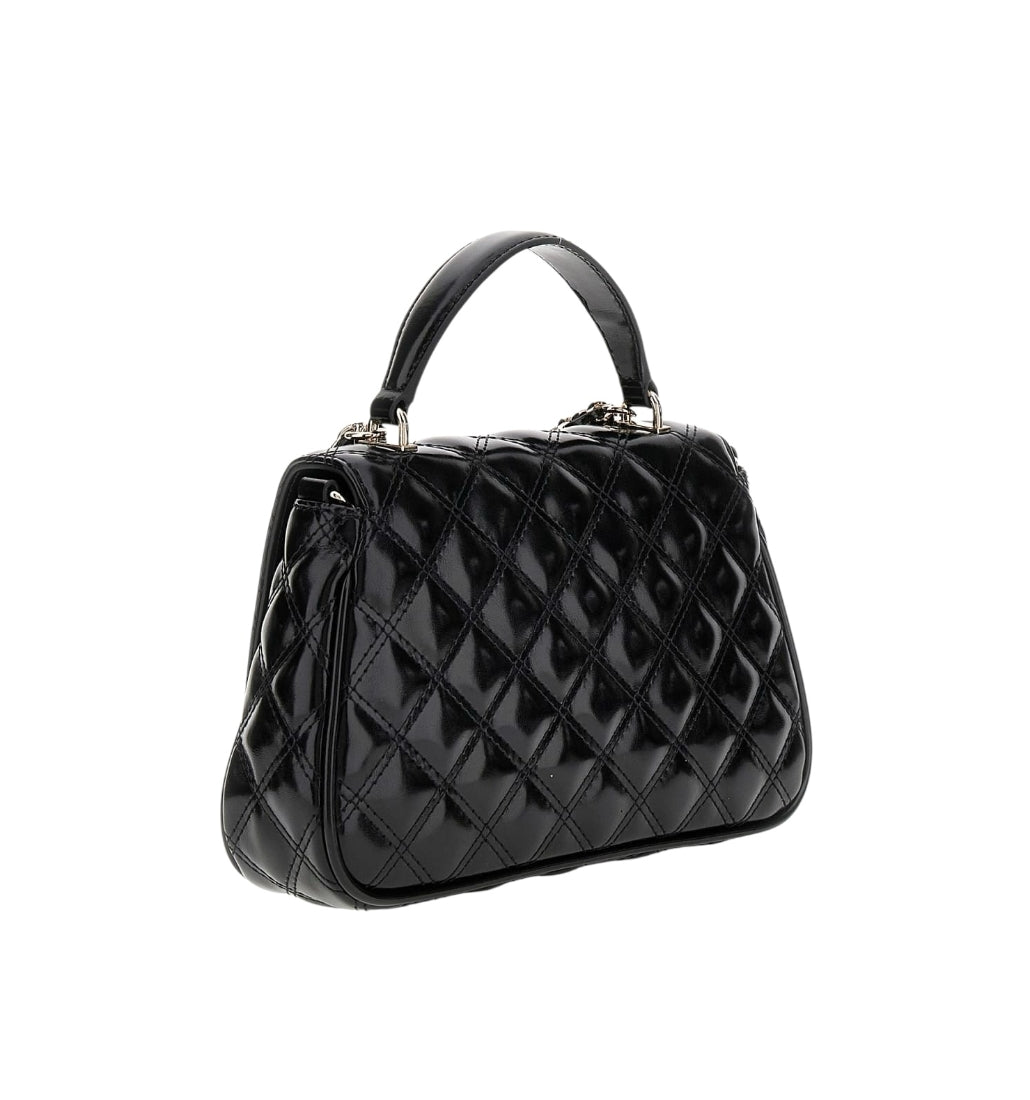 Kaunis Guess olkalaukku on pehmeä ja siinä on kaunis tikkikuvio. Laukussa on kaksi kulataista ketjua olevaa kantokahvaa ja säädettävä ja irroitettava olkahihna.  Laukku aukeaa magneettinepparillisella läpällä, jonka alta paljawstuu pääosio, jossa on pieni vetoketjutasku ja  3 korttipaikkaa.