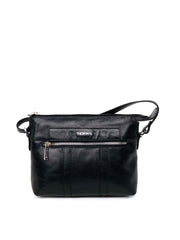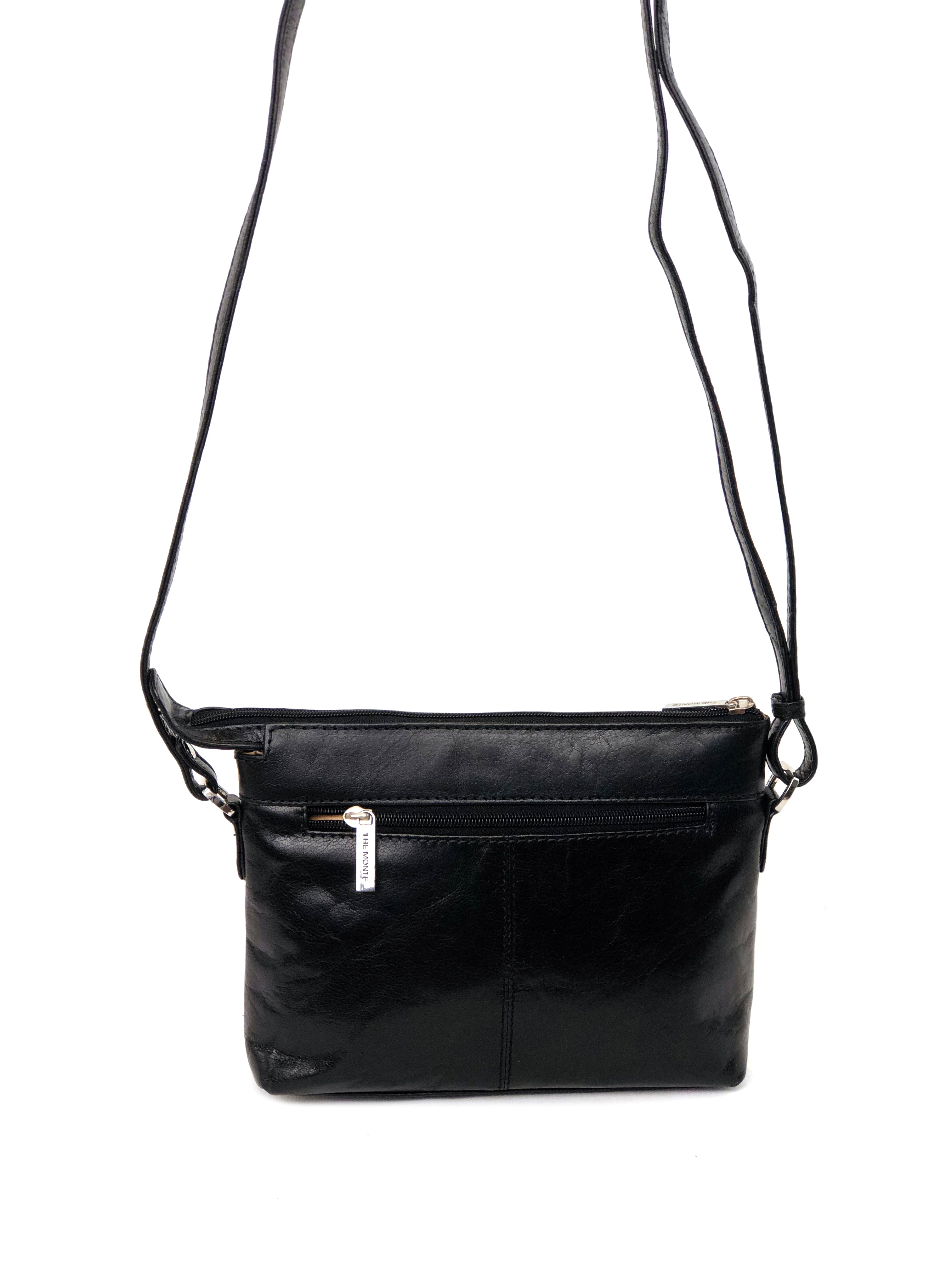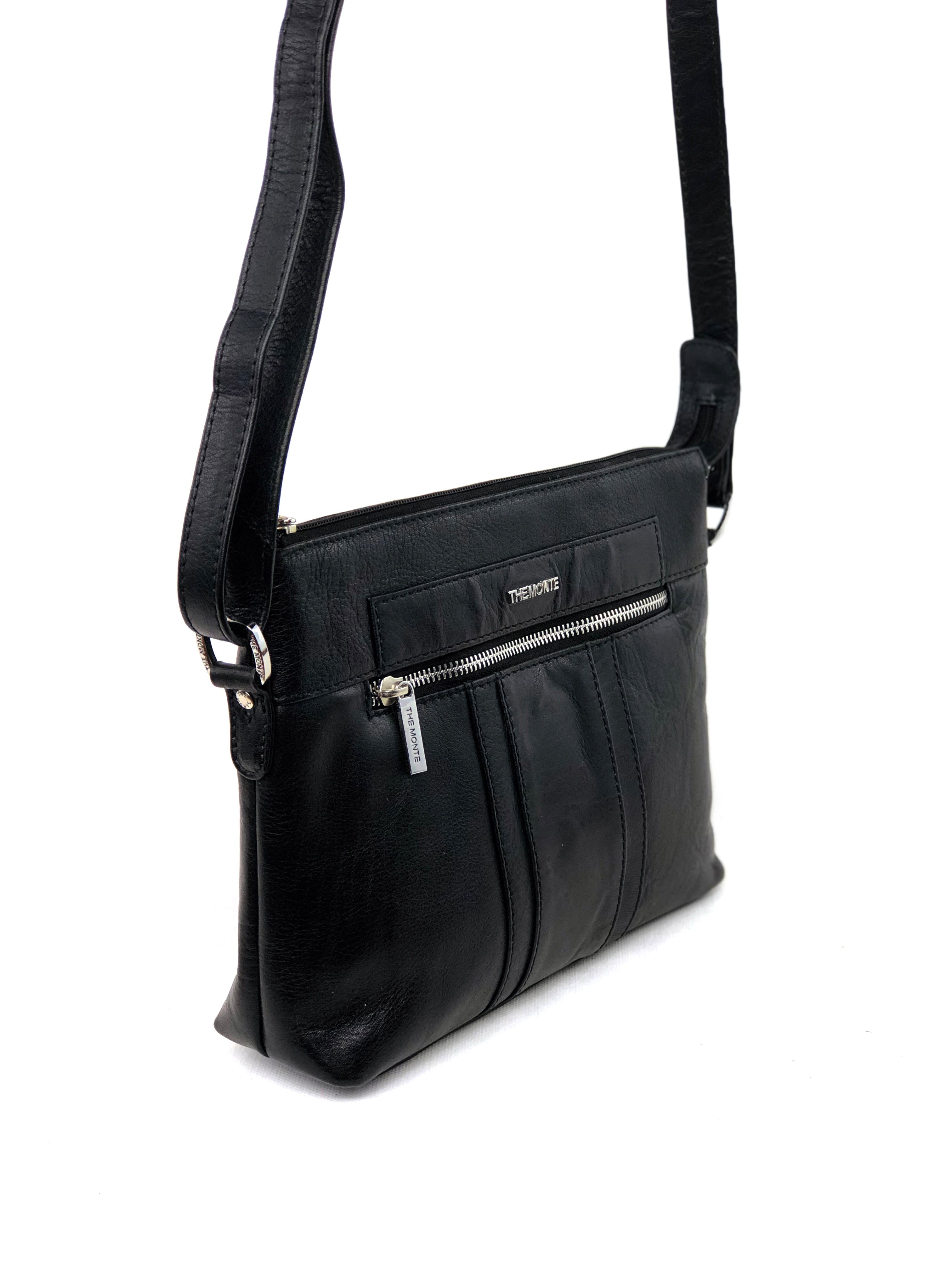 Pieni musta nahkalaukku pitkällä säädettävällä  olkahihnalla.  Laukun ulkopuolelta löytyy vetoketjutaskut edestä ja takaa. Sisällä on lisäksi vielä yksi vetoketjulla suljettava tasku.