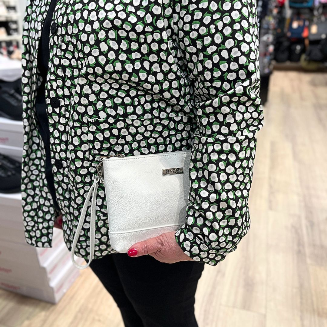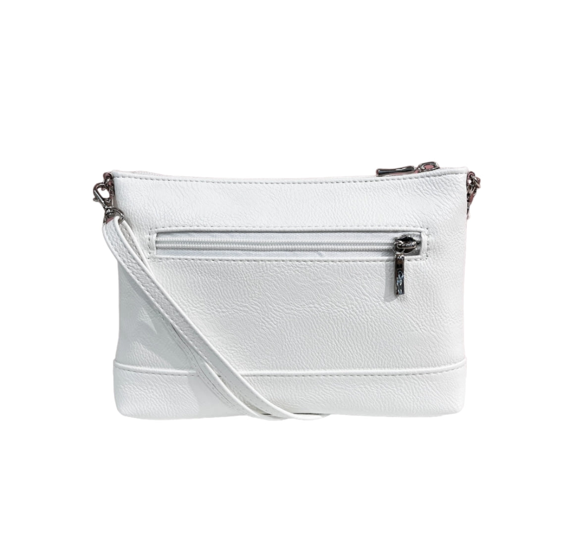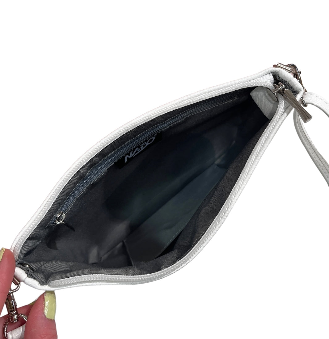 Kaunis kotimainen pikkulaukku on pehmeää jäljitelmänahkaa. Laukkuun mahtuu hyvin reilunkin kokoinen puhelin ja muu tarvittava. Laukun sisällä on pieni vetoketjutasku. Laukussa on pitkä irrotettava ja säädettävä olkahihna ja lisäksi irrotettava rannehihna. Laukku on valmistettu Suomessa.