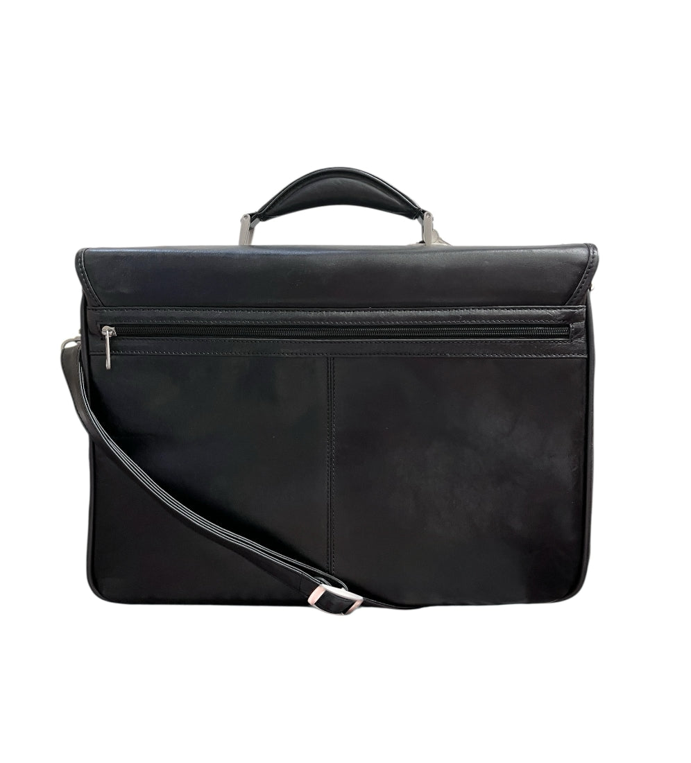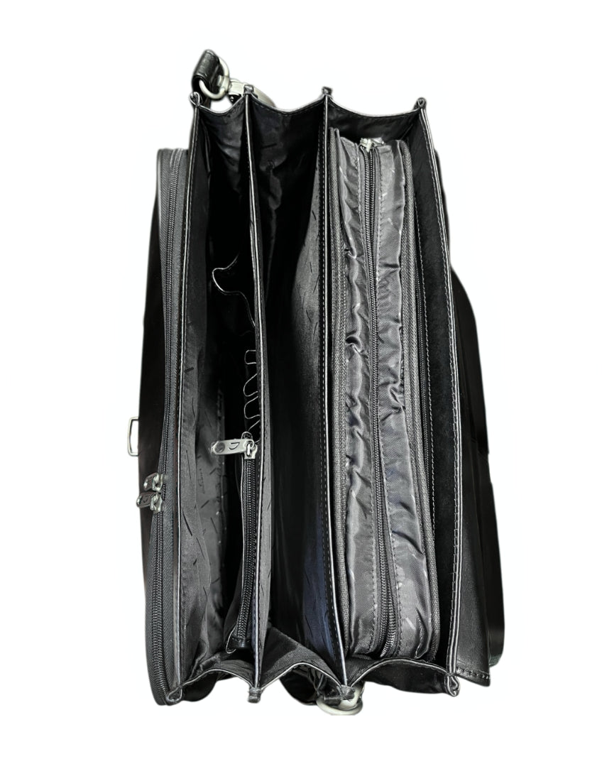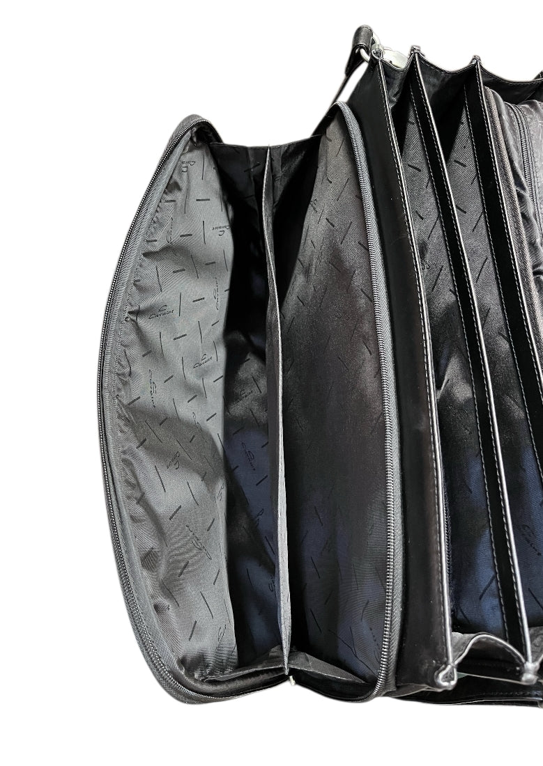Salkku sulkeutuu tyylikkäällä läpällä, jossa on painelukko. Lukon voi halutessaan sulkea avaimella. Läpän alta löytyy vetoketjutasku, joka on jaettu kahteen osioon. Pääosio koostuu kolmesta tilavasta osiosta, joissa tavarat pysyvät hyvässä järjestyksessä. Etummaisessa osiossa on vetoketjutasku, neljä kynäpaikkaa ja avotasku, ja takimmaisesta löytyy tilava vetoketjutasku sekä erillinen pehmustettu suoja kannettavalle tietokoneelle, jota voi käyttää yksinään. Laukun takana on vielä lisäksi vetoketjutasku.